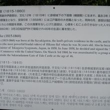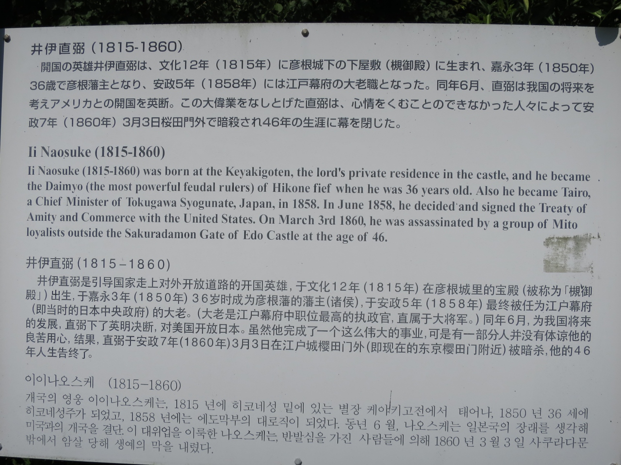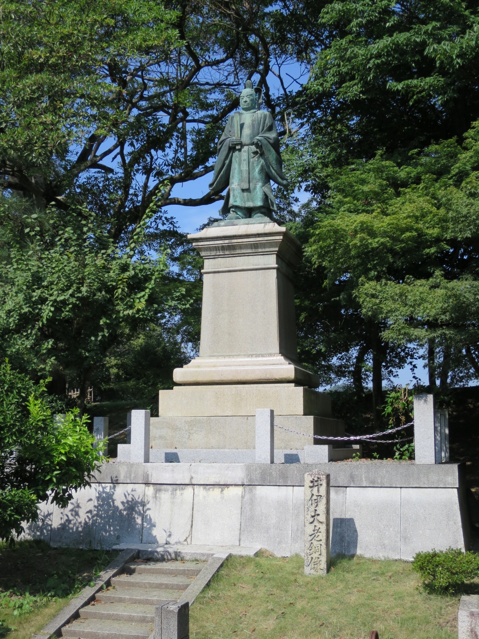 彦根藩 13代当主、桜田門外の変で有名な井伊直弼大老の銅像が玄宮園入口近くの駐車場脇に立っています。奥の方にあるので、気付かない人も多いと思います。