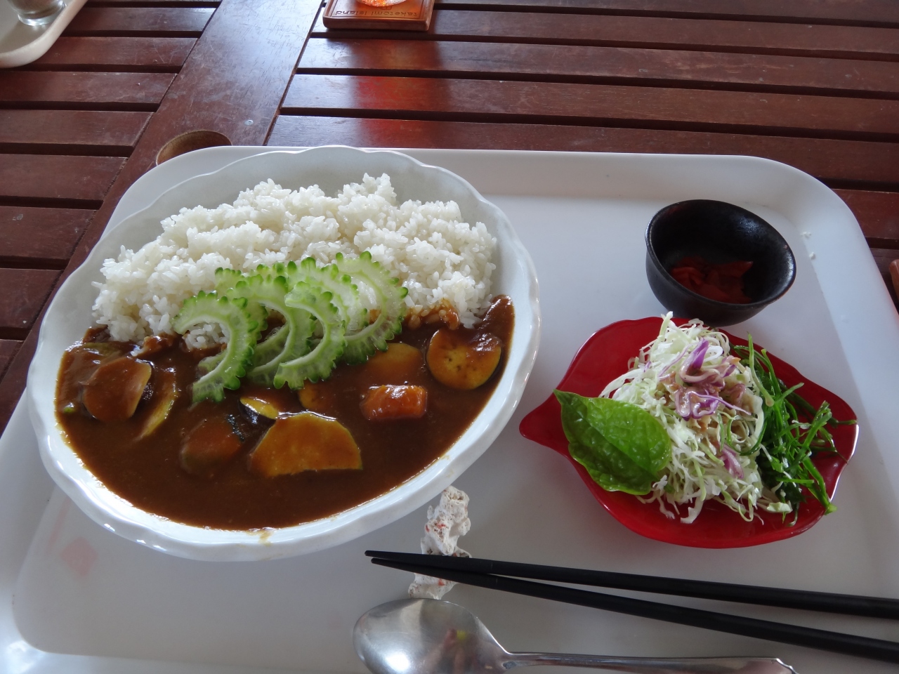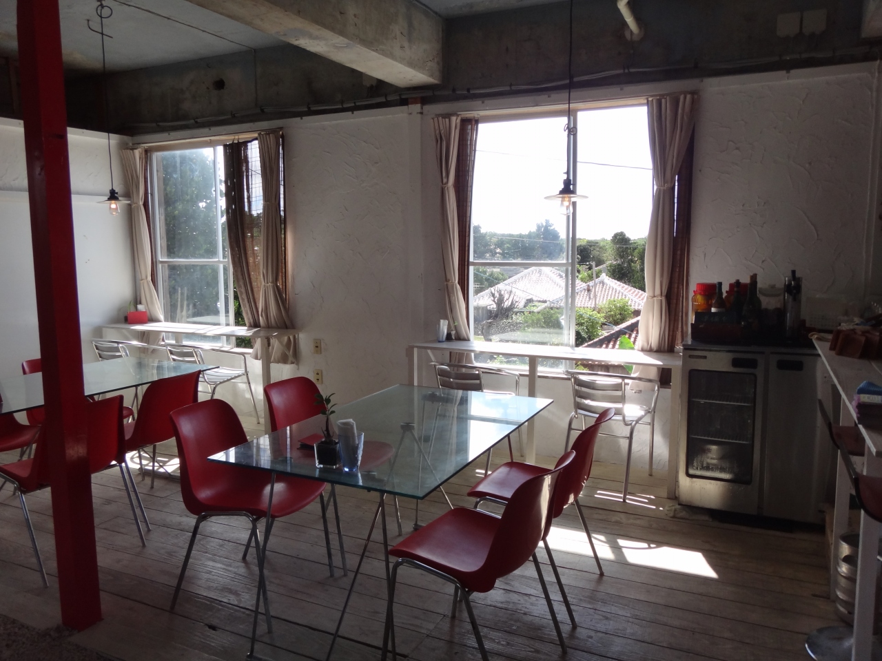 竹富島は27年前から平屋しか建てられないような協定ができたそうです。このレストランはそれ以前に建てられて2階にあるので、なごみの塔には怖くて登れない人も眺望が楽しめます。内装はモダンで窓から心地よい風が入ってきて、ゆっくり寛げます。