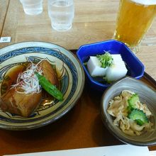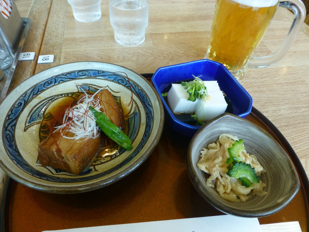あまりお腹が空いていなかったので、お昼なのにオリオンビールと島豆腐とミミガーとラフテーがセットになった「晩酌セット」を注文しましたが、沖縄から帰る前にふさわしいセットで、最後まで食事で沖縄を満喫できました。