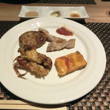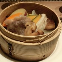 テーブルに着くと、最初におすすめの一品と称する蒸し野菜のせいろが運ばれる。