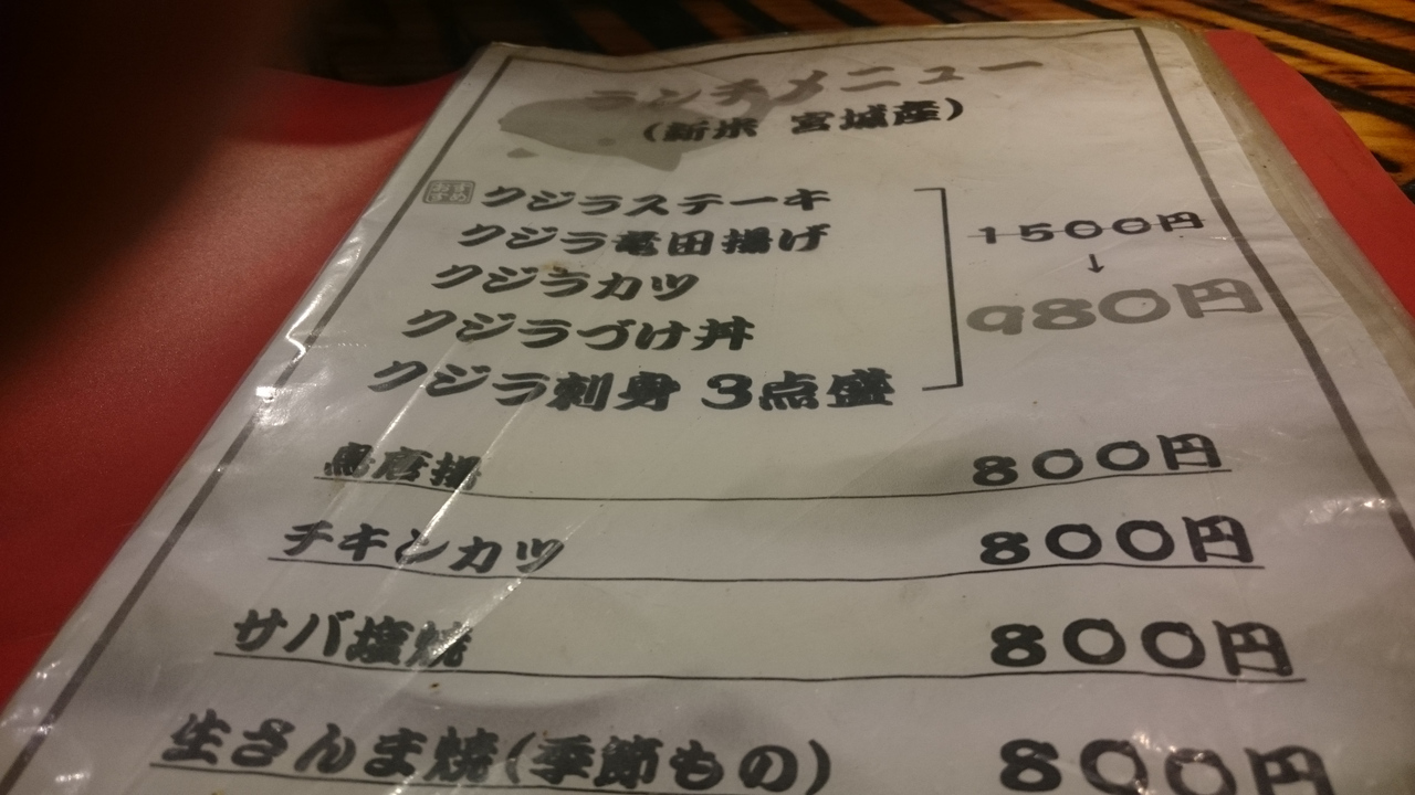 神田にあるクジラ料理メインの居酒屋。ランチは、クジラが、刺身三点盛り、竜田揚げ、カツ、ステーキ、漬け丼など、鶏とか秋刀魚もある。宮城県がバックグラウンドらしい。米は、宮城県産。クジラがランチで頂けるのは、珍しい。