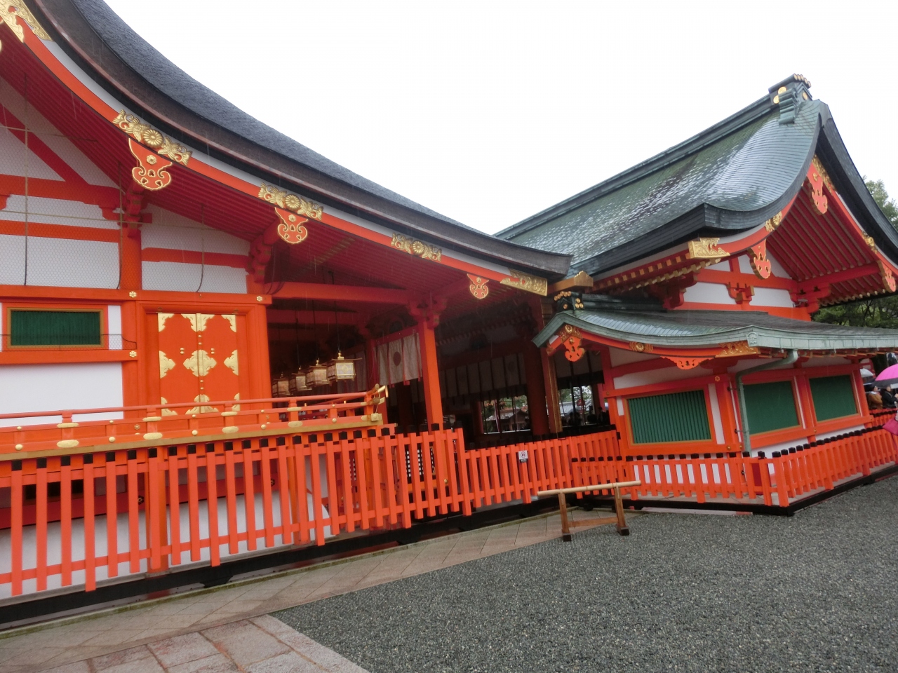 本殿の朱色が雨に煙り、美しい。