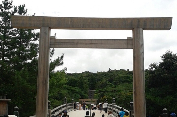 伊勢神宮外宮に参拝した後、内宮に向かいました。近くの駐車場が多分混雑しているだろうと思い、神宮会館横の駐車場に車を入れ、そこから徒歩で向かいました。まずは宇治橋です。聖俗を結ぶ橋とかこの先は空気が変わるとかいろいろ厳粛なイメージが特徴の橋ですが、聖域にも結構人がにぎやかなので、神様もちょっと戸惑っているのかな…といった感じでしたね。そうは言うもののやはり橋の中央にさしかかってまわりの景色を見ると一瞬だけ、空気が張り詰めたような気が致しました。
