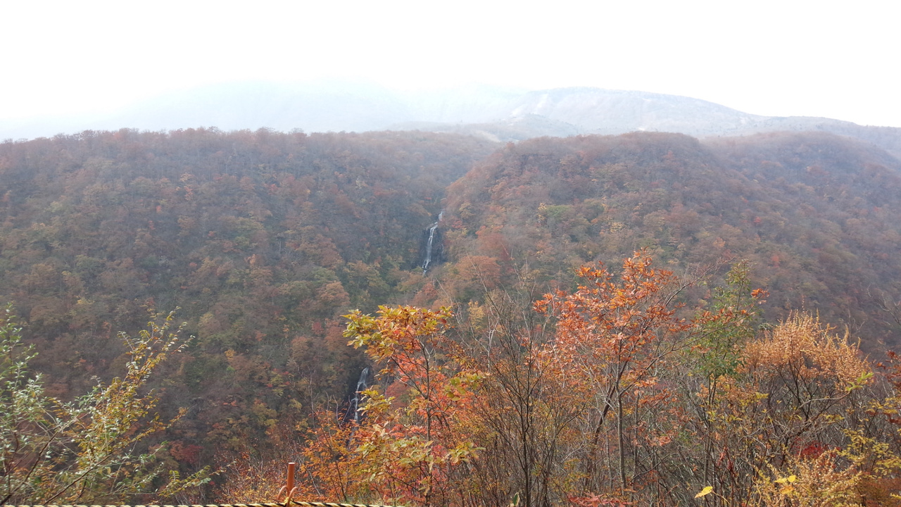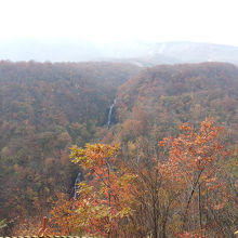 エコーラインの滝見台から見える2つの滝のうちの一つですが、滝壺が3段になっているので3階の滝と言うらしいのですが、木々に隠れて滝は2段にしか見えませんでした。紅葉ので囲まれた中に見える滝は遠くからでも綺麗でした。