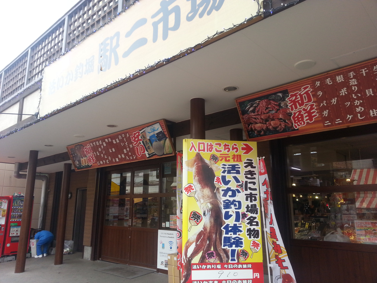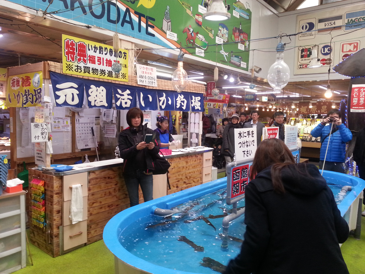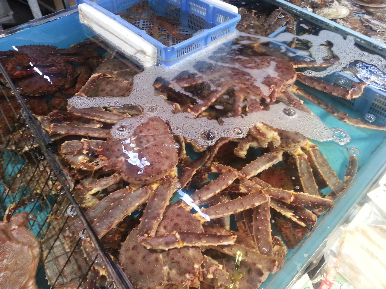 水槽で泳いでいるタラバガニ。やはり冷凍ものよりその場で茹でて食べるのが数段美味しいのは分かっていますが、2kgで1万8000円はちと厳しい。結果我慢しました。中ではいか釣りも出来、子どもが喜んで良かったです。