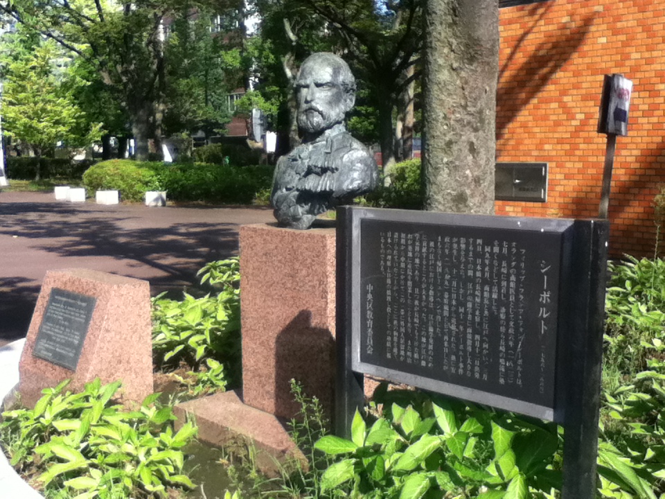 地下鉄築地駅の南西、あかつき公園内の東側にこちらの銅像がある。週末午後、公園には多くの家族連れ等が遊んでいたが、こちらの銅像を見ている人はいなかった。銅像の顔は彫りが深く立派な髭をはやし立派な容貌である。フィリップ・フランツ・フォン・シーボルトは、オランダの商館医院として文政6年長崎に到着し診療の傍ら塾を開くなどして活躍した。その後江戸の日本橋の長崎屋に止宿し江戸の蘭学者に面接指導し大きな影響を与えた。しかし、文政11年シーボルト事件が発生し日本から追放された。シーボルトやこの界隈に関心や知識のある方は、訪問するのもいいかもしれない。
