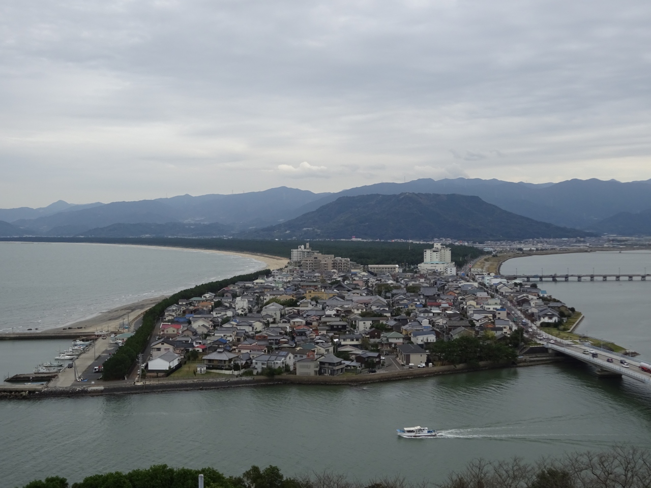 天守閣からは東西南北が一望できます。東側には長い砂浜と砂州、そこには緑の松がぎっしり植わっています。唐津藩初代藩主寺沢広高公が慶長年間から植林したものだそうで、国指定特別名勝になっています。