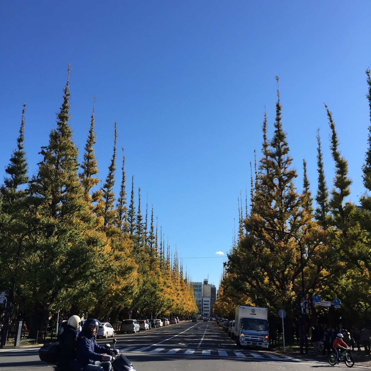 綺麗な形に整ってるいちょう並木がきれいです。奥に、全国の美味しそうなご当地グルメが食べられる屋台が沢山出ていました!芝生には貸し出しのレジャーシートもあるし、机と椅子も用意されていました。気持ちよかったです、