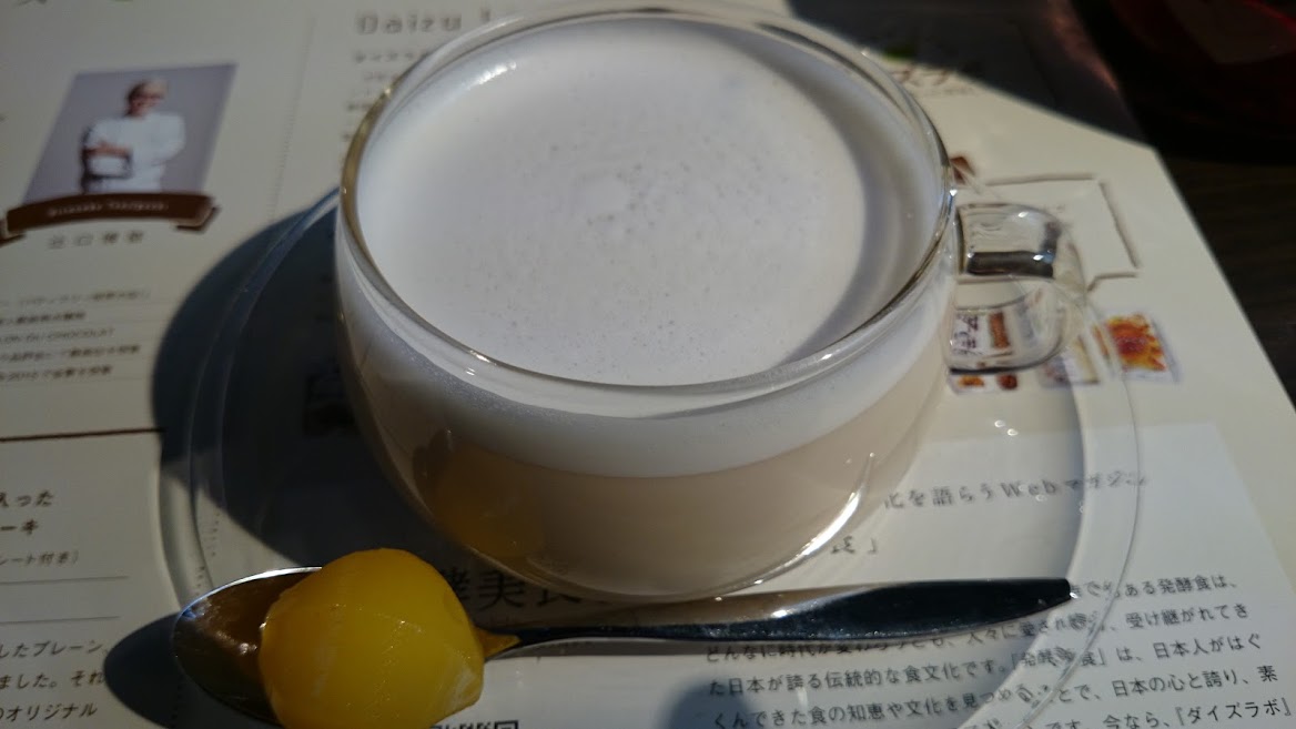 入店時にコンセントが必要かどうか、店員さんが聞いてくれてテーブルに案内してくれました。注文したのは甘酒のドリンク。温まりました。