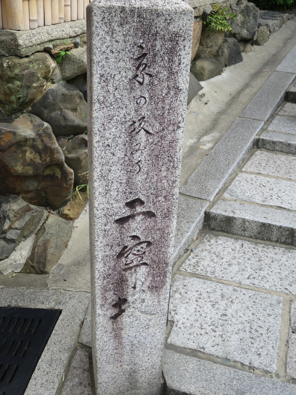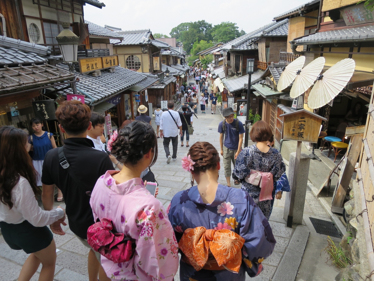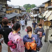 京都 東山の産寧坂に続くゆるやかとした人気観光地の坂です。たくさんの観光客に混じり舞子姿の人が時折居られますが、舞子体験の人が多い様です。外人観光客とっては絶好の撮影体になっています。あんまり、この辺りには本物は現れないと思います。