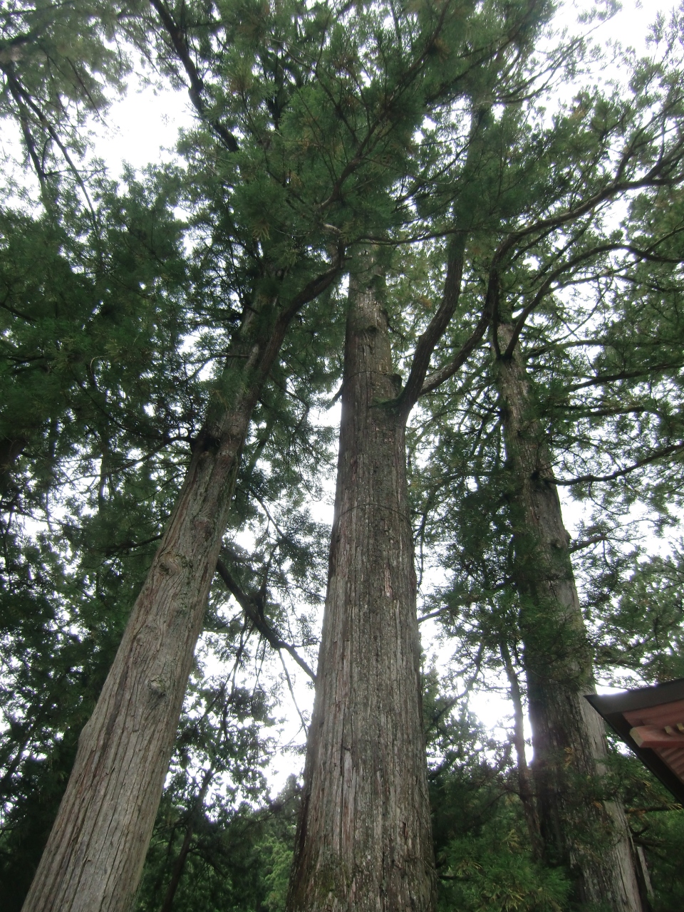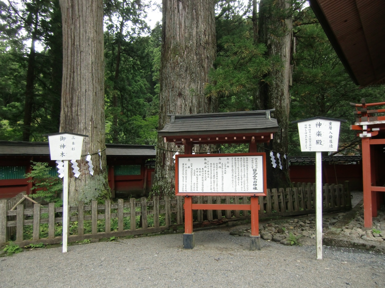 本殿正面参道の大鳥居から入り、神門を抜けた左手に御神木があります。三本の巨杉で、女峰山の女神が降臨したという御神木でだそうです。当初の三本は、元禄十二年(1699年)、延享四年(1747年)、寛延二年(1749年)にそれぞれ倒れ、現在の木は二代目だそうです。