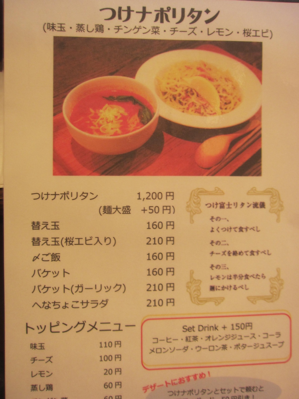 岳南電車吉原本町駅から商店街を15分くらい歩いたところ、富士急バスの吉原中央駅の手前にあります。メニューはつけナポリタンだけではなく、ハンバーグやピザなどもありましたが、名物ということでつけナポリタンをいただくことにしました。