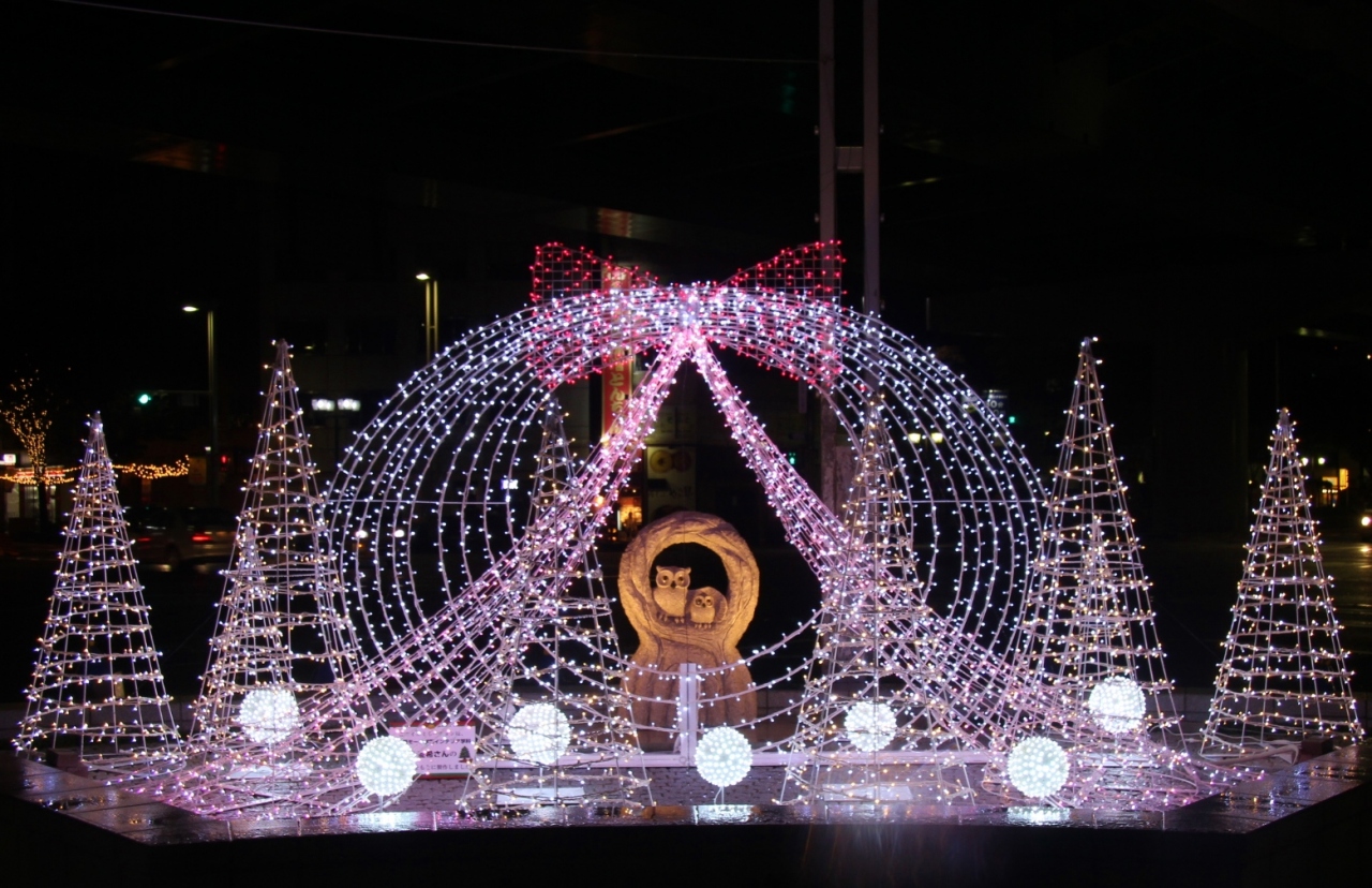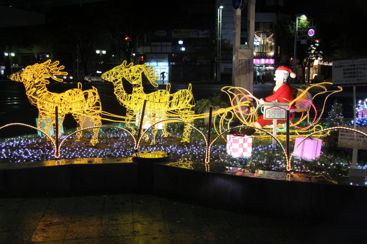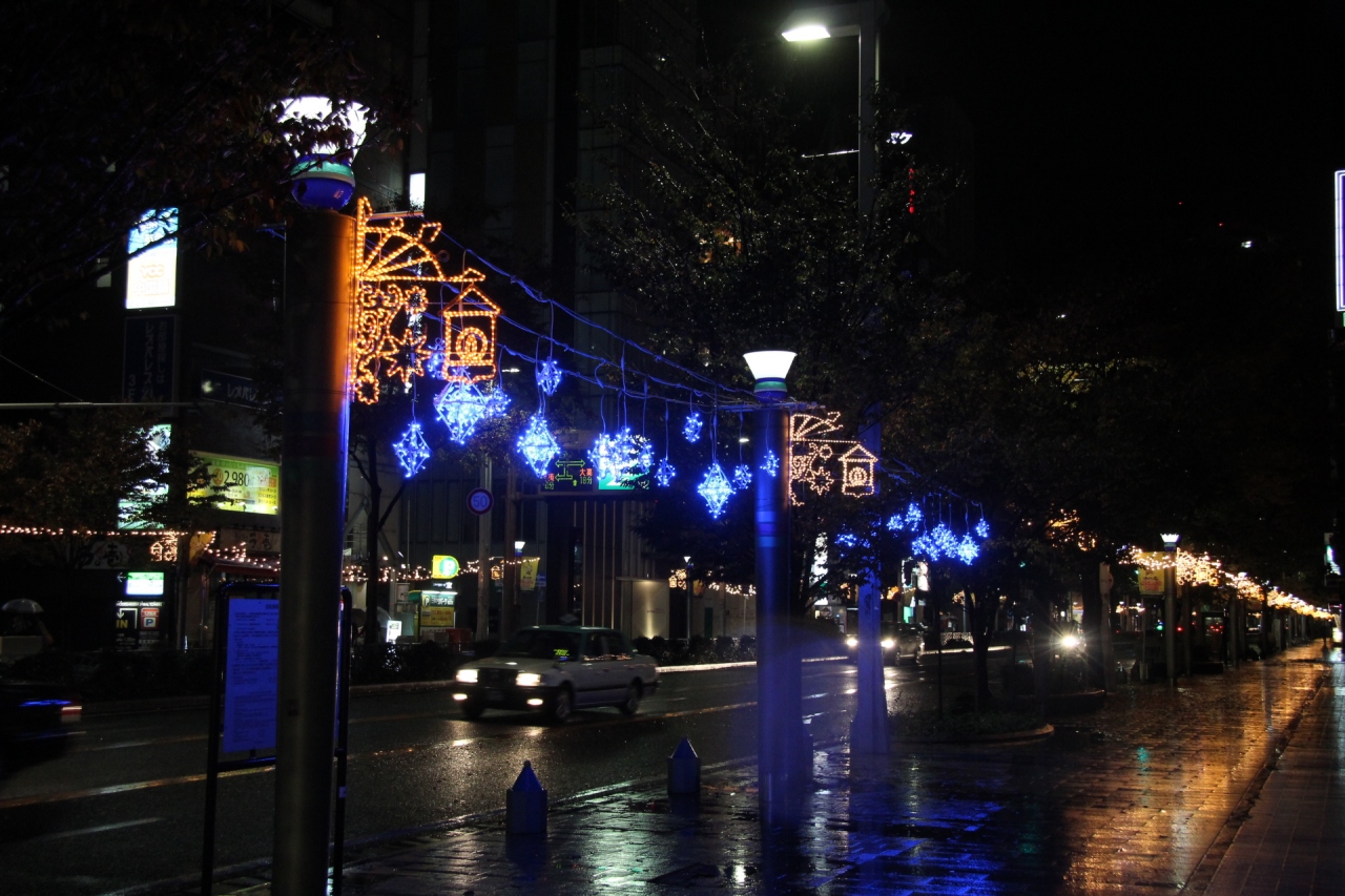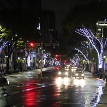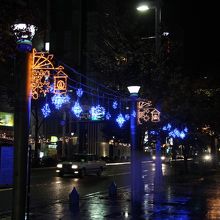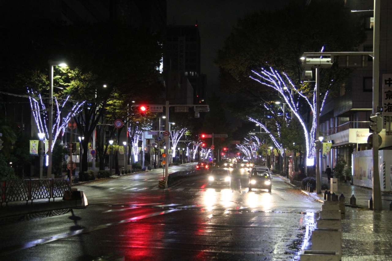 名古屋駅前の笹島交差点から広小路葵交差点まで 名古屋市を横断する広小路がイルミネーションで飾られていました。柳橋交差点にはそりに乗るサンタクロウスやフクロウのイルミネーションが飾られていました。また街路樹には電球が取り付けられていて綺麗でした。