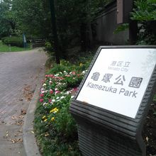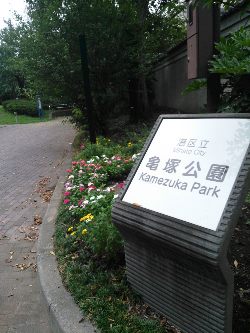 三田の聖坂を上って少し行ったところにある公園で、園内は良く手入れされていて雰囲気のいい公園です。名前にあやかったのか亀の遊具などもありました。また、名前の由来になった亀塚が園内に築山のように残っており、登って周囲を眺めることもできました。