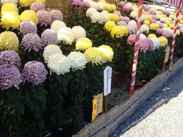 彦根駅から徒歩10分程度、彦根城址前にある神社です。 訪れた日は境内で菊花展が開催されており、盆栽や懸崖等が400鉢ほど並んでいました。どの菊も丹精込めて栽培されたもので見応えがあります。見頃は11月の第1週となっていましたので、丁度良い時期に行くことができました。