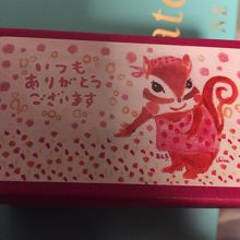持ち帰りクッキーやさん。お値段はちょっとお高めですが美味しい。箱に描かれた沢山の種類のかわいいリスの絵と、メッセージ。ありがとう、お誕生日おめでとう、などのメッセージが選べ、プレゼントに利用しています。選ぶのが楽しいです。