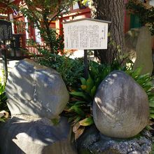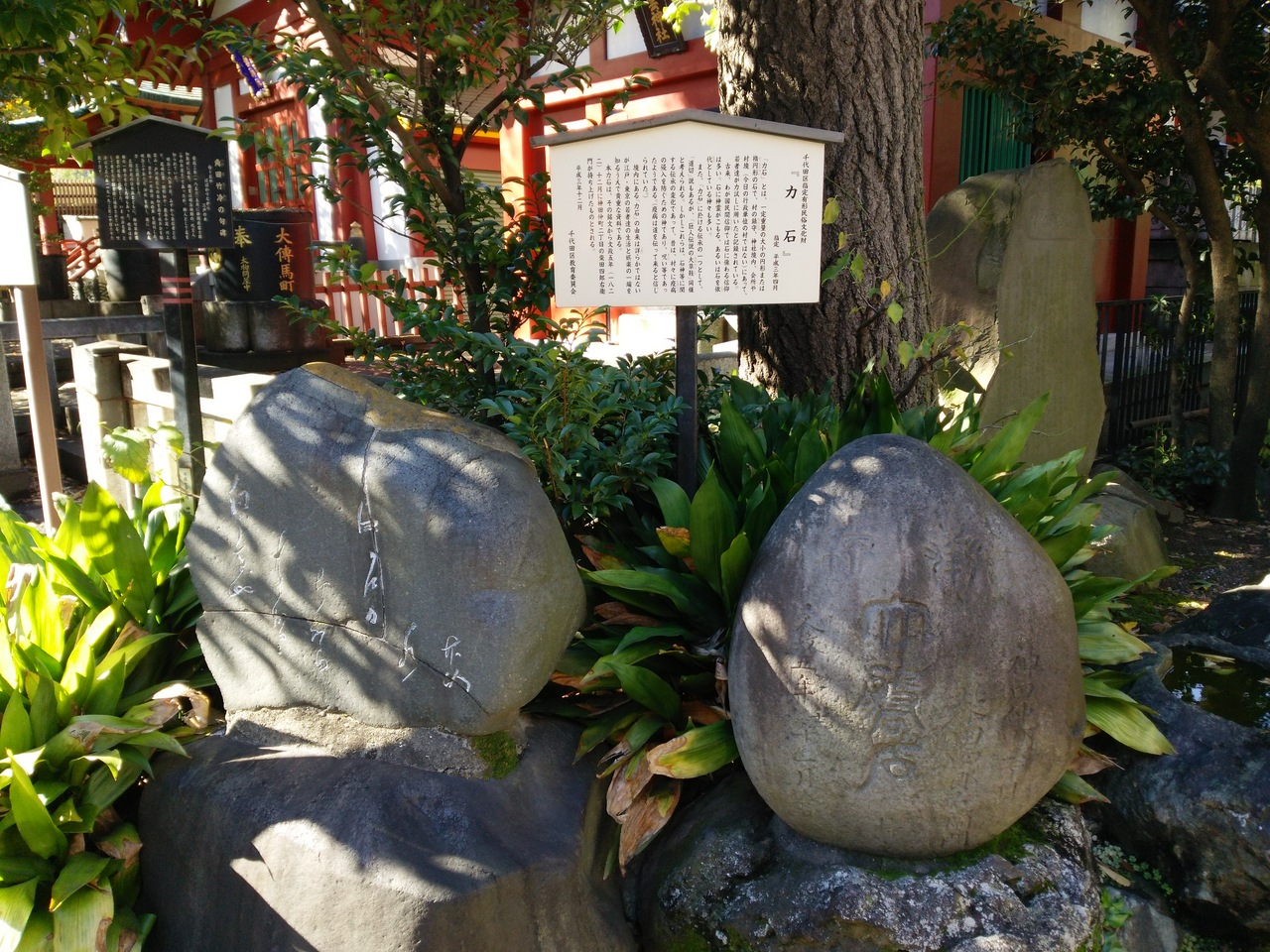 力石とは、一定重量の大小の円形または楕円形の石で若者たちが力試しに用いたと言われているものです。力石の由来には諸説あるようですが、神田明神の境内にある力石の由来は詳らかではありません。なお、この力石は、その銘文から1822年(文政5年)12月に神田仲町二丁目の柴田四郎右衛門氏が持ち上げたものとされているようです。