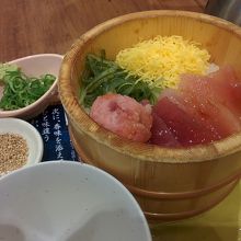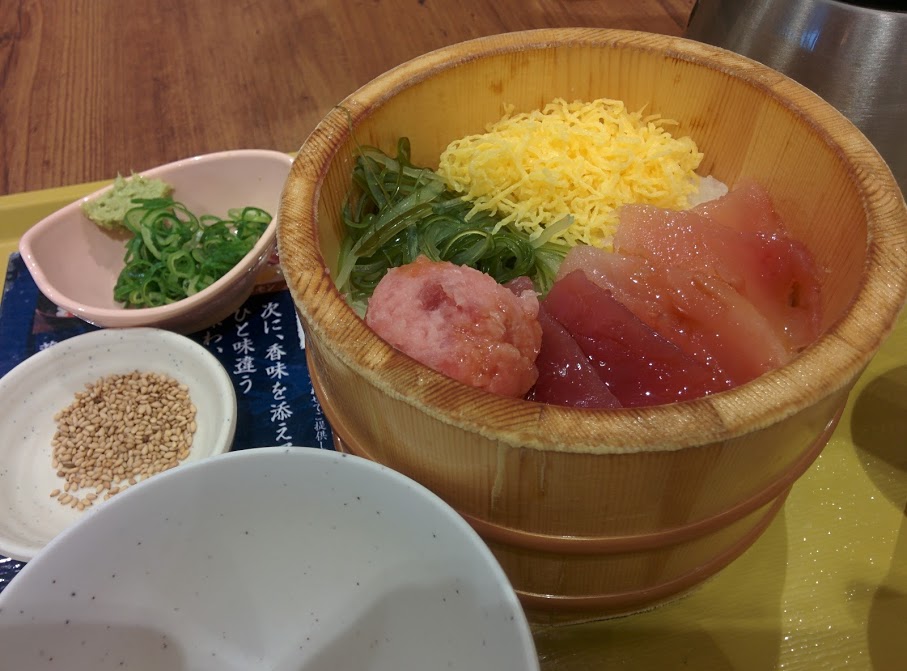 海鮮丼としてみると、フードコートだしこんなものかな、という感じですが、薬味を加えて、さらに白だしをかけてお茶漬けにして、三度も楽しめます。