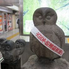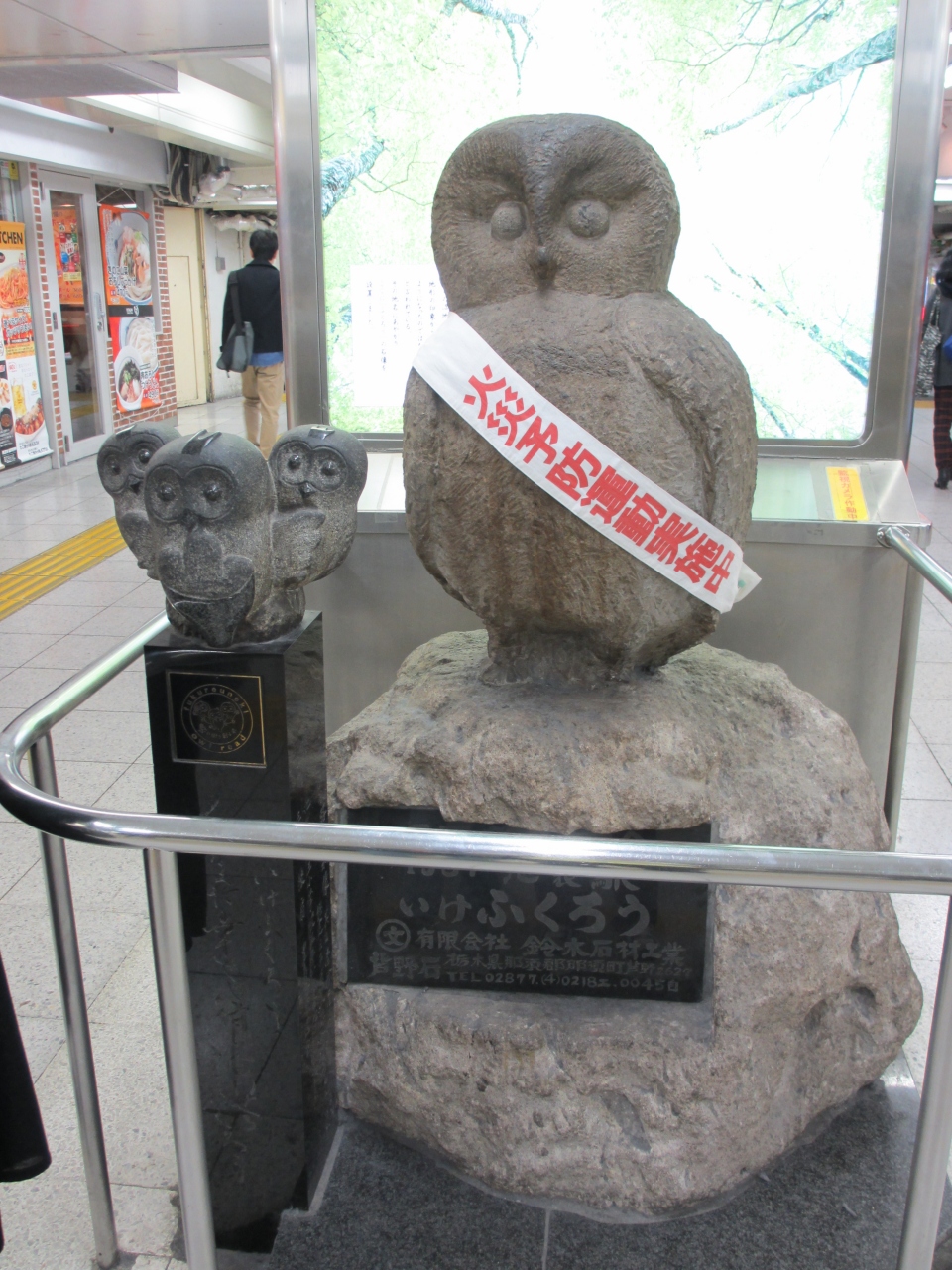 池袋駅北口から東口に向かう通路の、東口側にある1.5mほどのフクロウの像です。かつてよく利用していた池袋ですが、いつから立っているのか知りませんでした。多くの人が行き交う場所なので、あまり目立たず、ひっそり立っている感じでした。