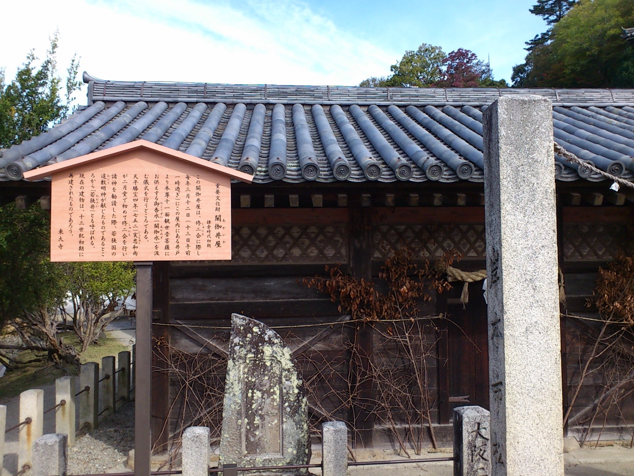 鎌倉時代に建立された切妻造の建物で、国の重要文化財に指定されています。霊水の湧く「若狭井」の覆屋です。二月堂へ登る階段の登り口にあります。毎年3月に二月堂で行われる修二会(お水取り)で、この若狭井から汲み上げて本尊の十一面観音に供えるのがお香水です。