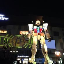 ちょうど プロジェクターを使った演出が始まる所で お客さんがいっぱいでした。見上げる感じの画像と 大きいガンダムなので どこからでも楽しめます。 頭は動くし目は光るし 相当かっこよかった!