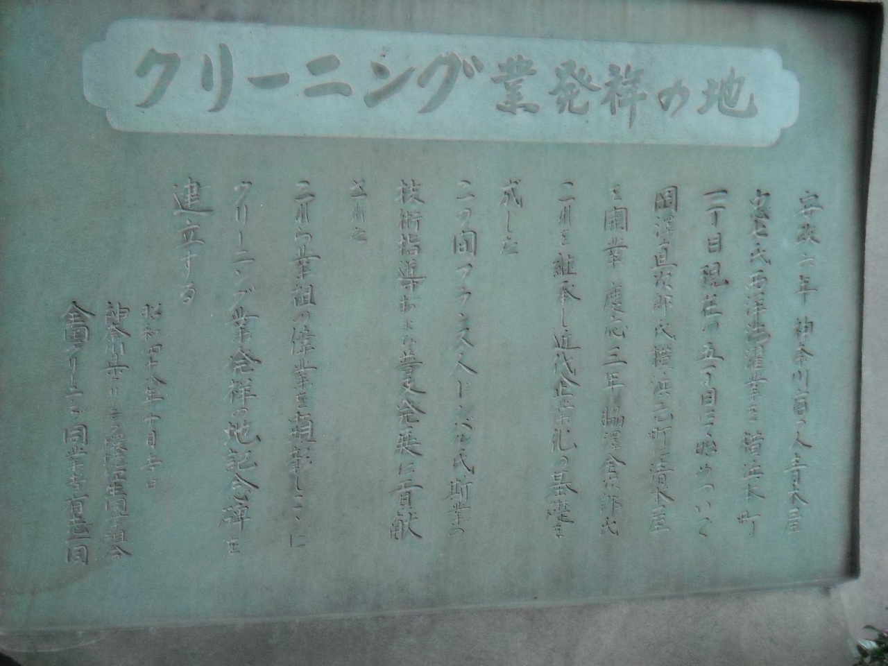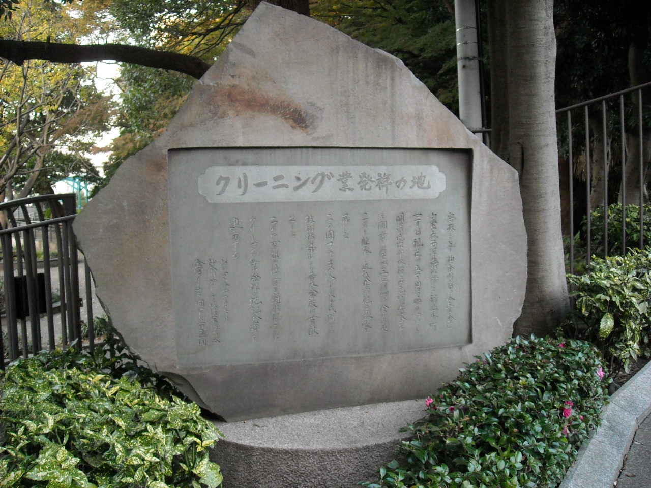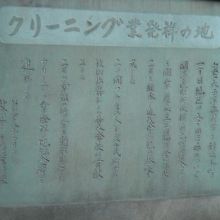 安政時代に日本人がフランス人の手ほどきを受け開業し今日に継承。この近くではないらしいので公園の外側に設置。当時のクリーニングはどんなものだったのでしょうか? 繊維や服の形状も全く違うし物によっては薬品も異なるし。石鹸なども作ったのか。