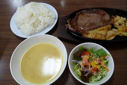 高速道路を終点で降りて許田の道の駅によりました。物産センターの中はフードコートになっていました。穀物牛リブロースステーキ180グラム1500円をいただきました。ライスと不思議な味のスープがついていました。ステーキはオージービーフらしくリブロースなのにあまりジューシーではなかったのが残念です。大盛は50円増しです。