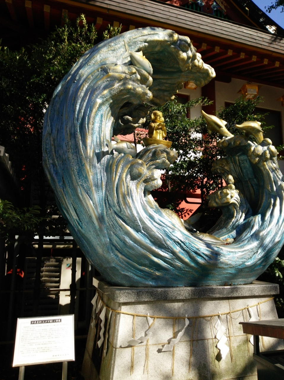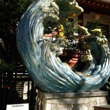 神田明神境内にある鳳凰殿脇に建立されている二の宮のご祭神「えびす様」のご尊像です。海の仲間(イルカやタイやトビウオ)に守られて大海原を渡られる「えびす様」の姿が造形されています。ちなみに「えびす様」は正式のお名前を少彦名命(すくなひこなのみこと)というようです。