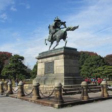 皇居外苑・皇居前広場の一角に建っている、正成が馬に乗って皇居方面を見ている大きな銅像です。別子銅山開坑200年を記念して、住友家が東京芸大に依頼して作製したものです。別子銅山の銅を使用して10年かけて作られました。