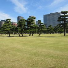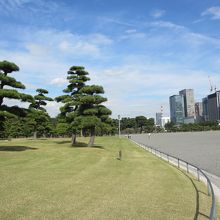 正門石橋(二重橋)前に広がる、広い芝生に何本ものクロマツが植えられた緑豊かな公園と、砂利が敷きつめられた広場から成り立っています。二重橋前では橋と石垣と白壁の伏見櫓をバックに多くの外国人が写真を撮っている姿が見られます。