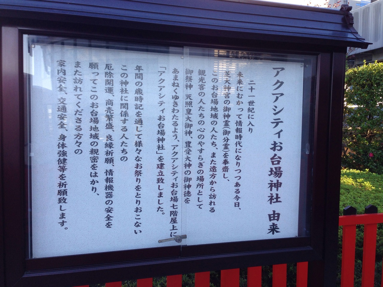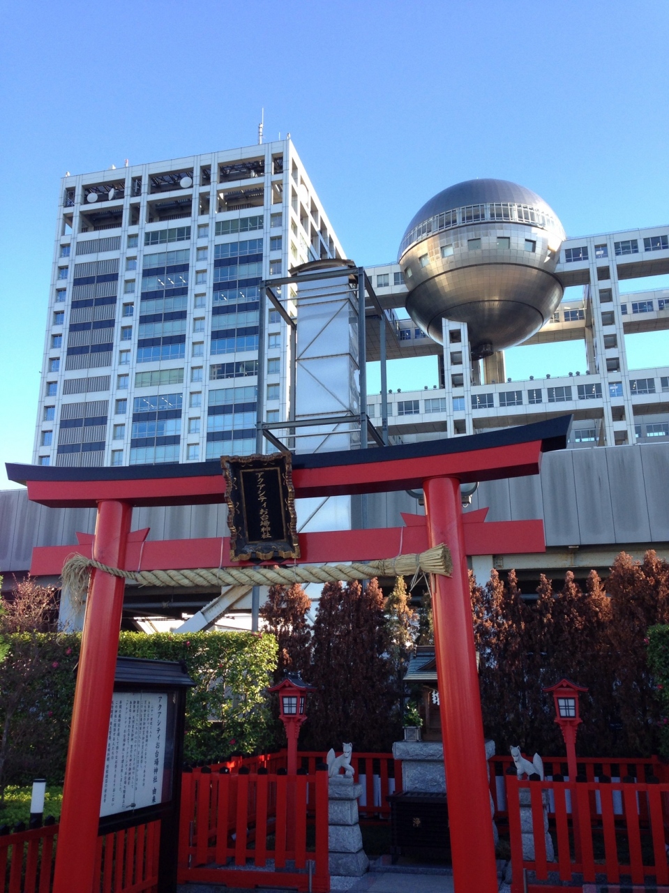 おみくじはアクアシティの館内にあったり鳥居越しにフジテレビの球体が見えたり、他とは一味違う神社です。