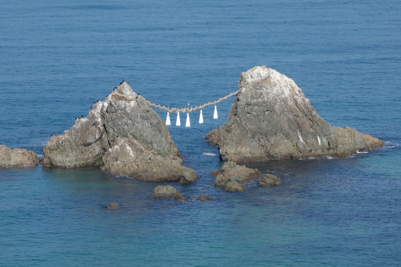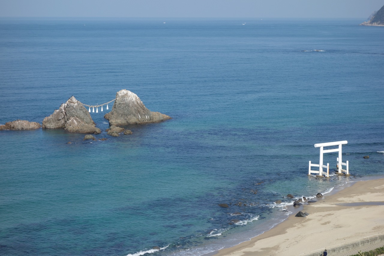 日本の渚百選に選ばれているそうで夫婦岩と鳥居が特徴的です、今回は昼に訪れましたが夕日が岩の間を落ちるところは一度見てみたいものです。
