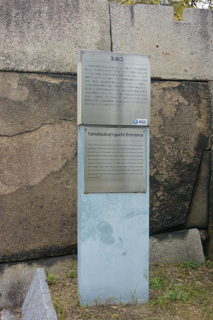 大阪城公園を抜けて、きつい階段を上がって右に曲がると、玉造口です。少し離れた所にはバスの駐車場もあるみたいで団体のお客さんもあって、けっこう大勢の人が利用していました。また、自動車の通行もOKのようでタクシーが度々通っていました。