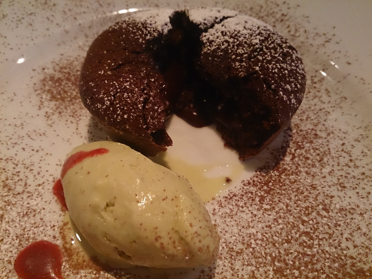フォンダンショコラとピスタチオアイス。外側サクサク、中とろとろのチョコが最高。