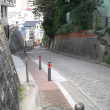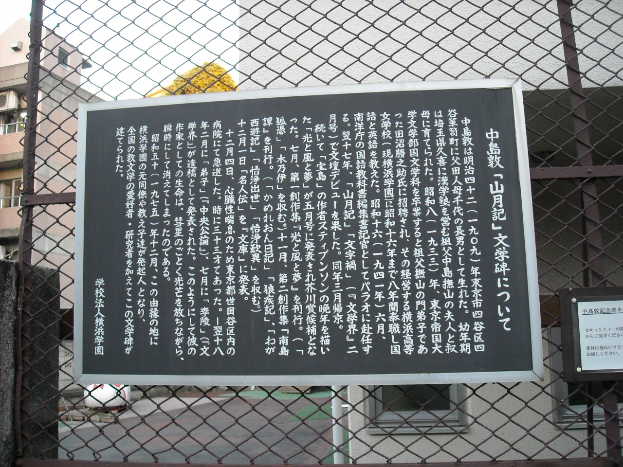 中程から一気に勾配が増すようですがほとんど石碑やプレートの類はありません、ただ登り切れば御褒美として信号機に地名が明示されているのが読めます。途中の幼稚園の柵上に中島敦の文学碑が掲げられ奥の方に記念碑が建っています。開園していれば見学可。