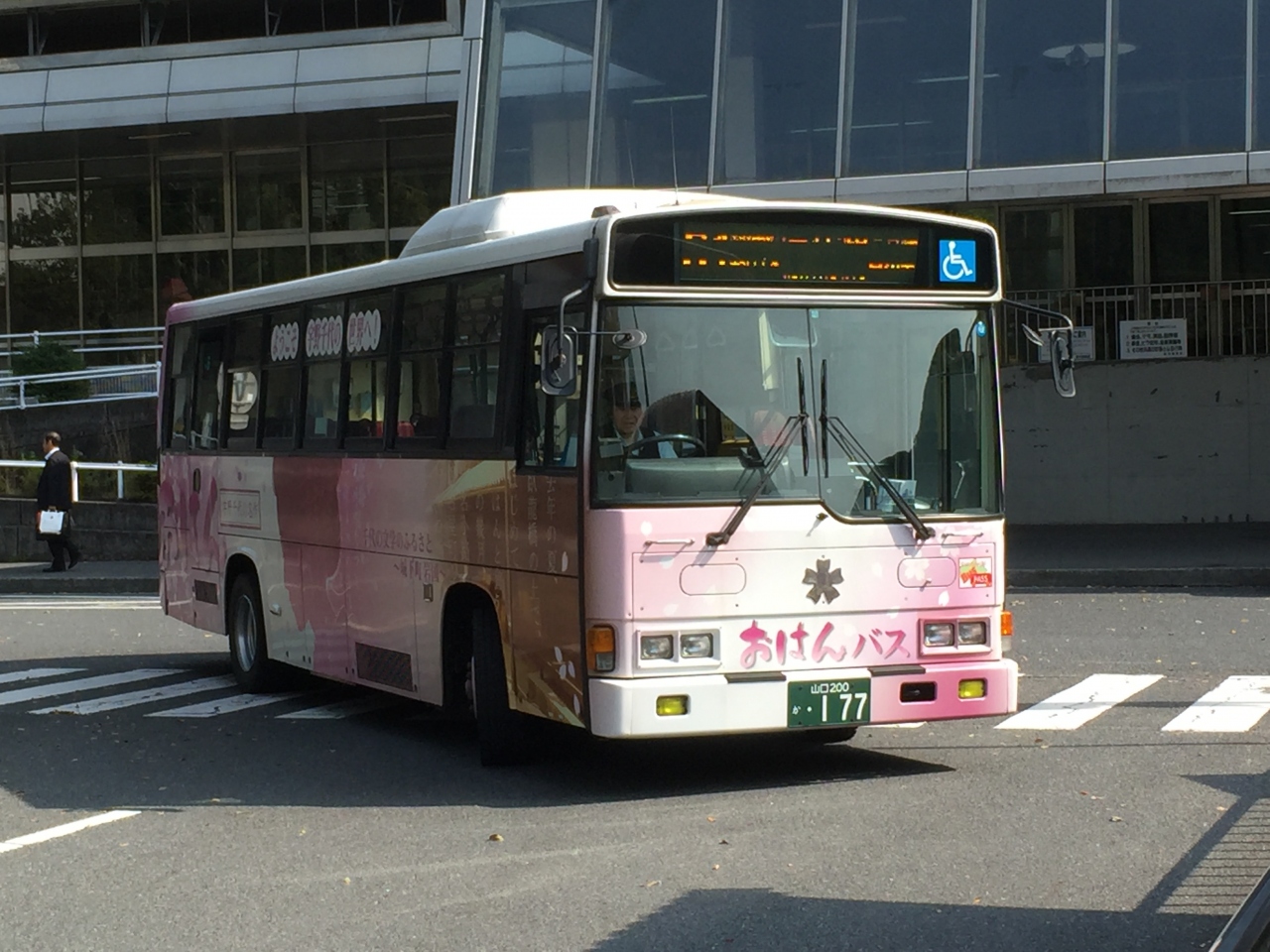 錦帯橋を走るいちすけ号や、岩国駅と新岩国駅を走るバスにはおはんバスや島耕作バスが走っています。