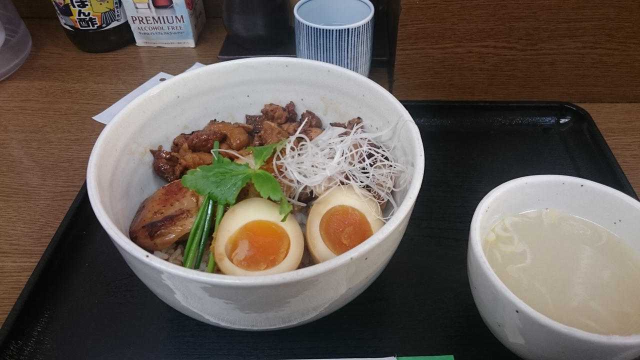 築地市場場内の鶏肉料理。寿司屋の行列を他所に、カウンター席へ。行列ができることもある。親子丼が人気メニューだが、今回は鳥めしを頂く。煮玉子、モモ肉、小さい肉がのる。甘い味付けだが、良い味である。スープも良い。