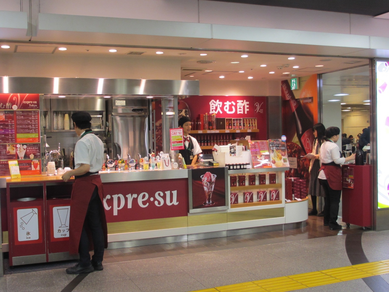 東京駅構内地下1階グランスタにあります。各種酢ドリンクとソフトクリームがあります。持ち帰りですが、すぐ近くにベンチが並んである休憩所ビュースクエアがあるのでそこでゆっくり飲食できます。フルーツの酢が爽やかでほんのり甘く美味しいです。
