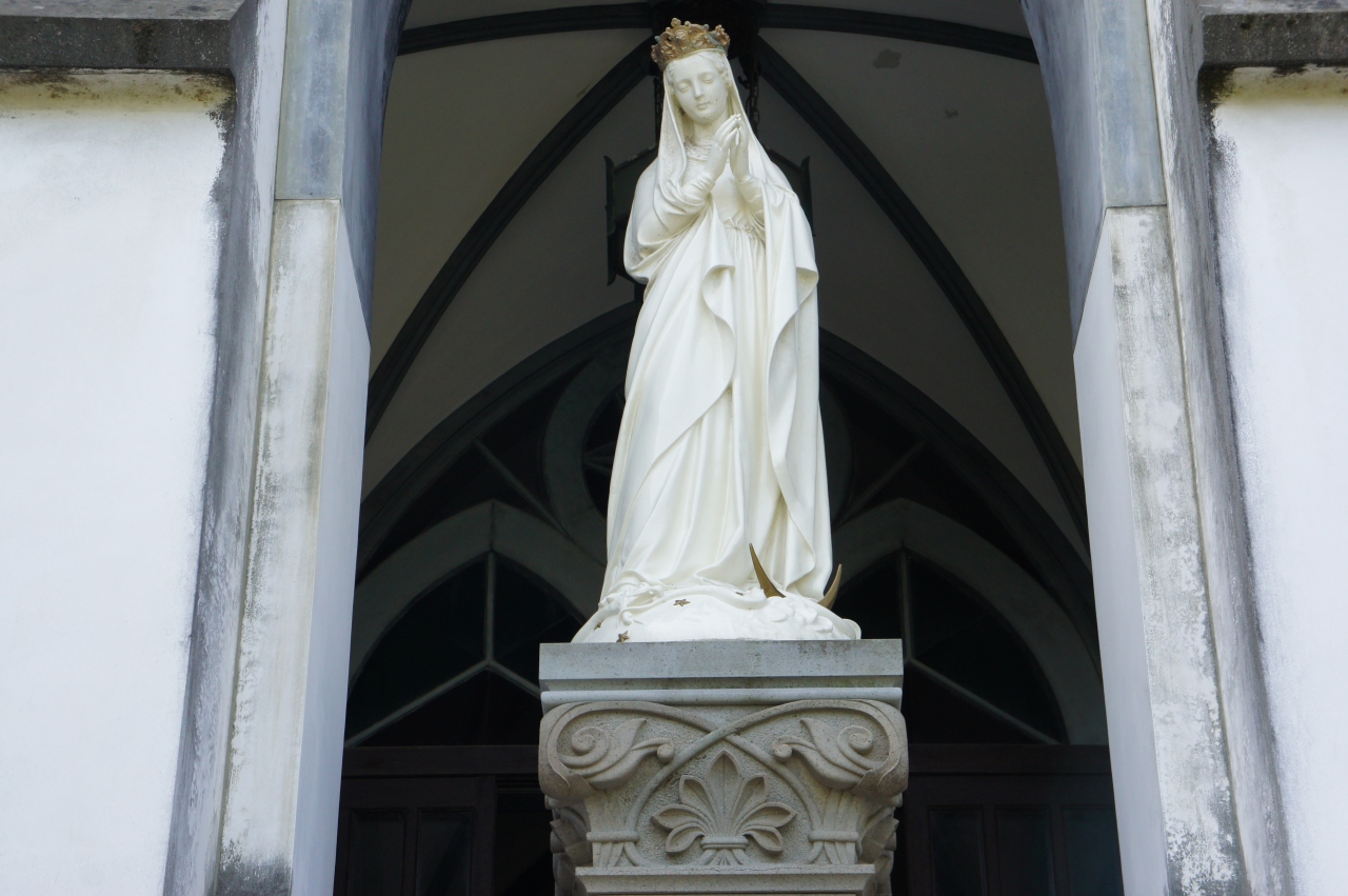 また、教会建設時に、鎖国時代を生き抜いた隠れキリシタンが神父に信仰を告白した地でもあり、天主堂の前にフランスから記念に送られたマリア像が建立されています。