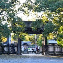 京都御苑には全部で九つの門がありますが、この門もそのうちのひとつです。御苑の西側に位置し、烏丸通に面して建っています。烏丸通を隔てて向かい側には平安女学院の聖アグネス教会や菅原院天満宮神社があります。