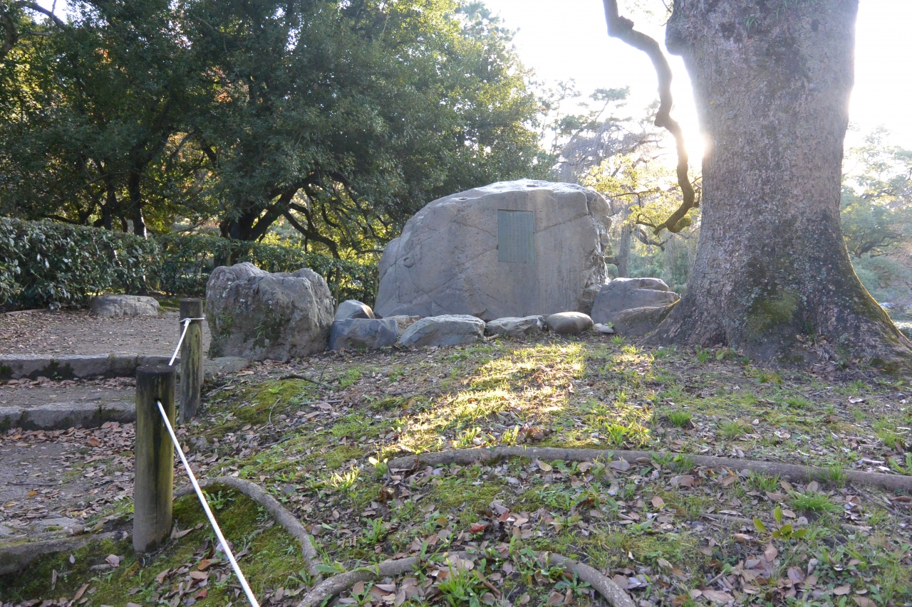 賀陽宮邸跡地の小高い丘の上に据えられている記念碑で、階段で上がれるようになっています。賀陽宮は孝明天皇の信任の厚かった中川宮が改称した名前です。記念石の裏側に碑の由来を記した銅版がはめ込まれており、賀陽宮没後四十年の昭和六年に宮の遺徳を偲び、宮邸跡に記念碑を建てたことが記されています。