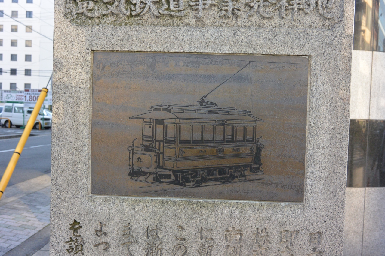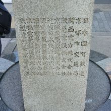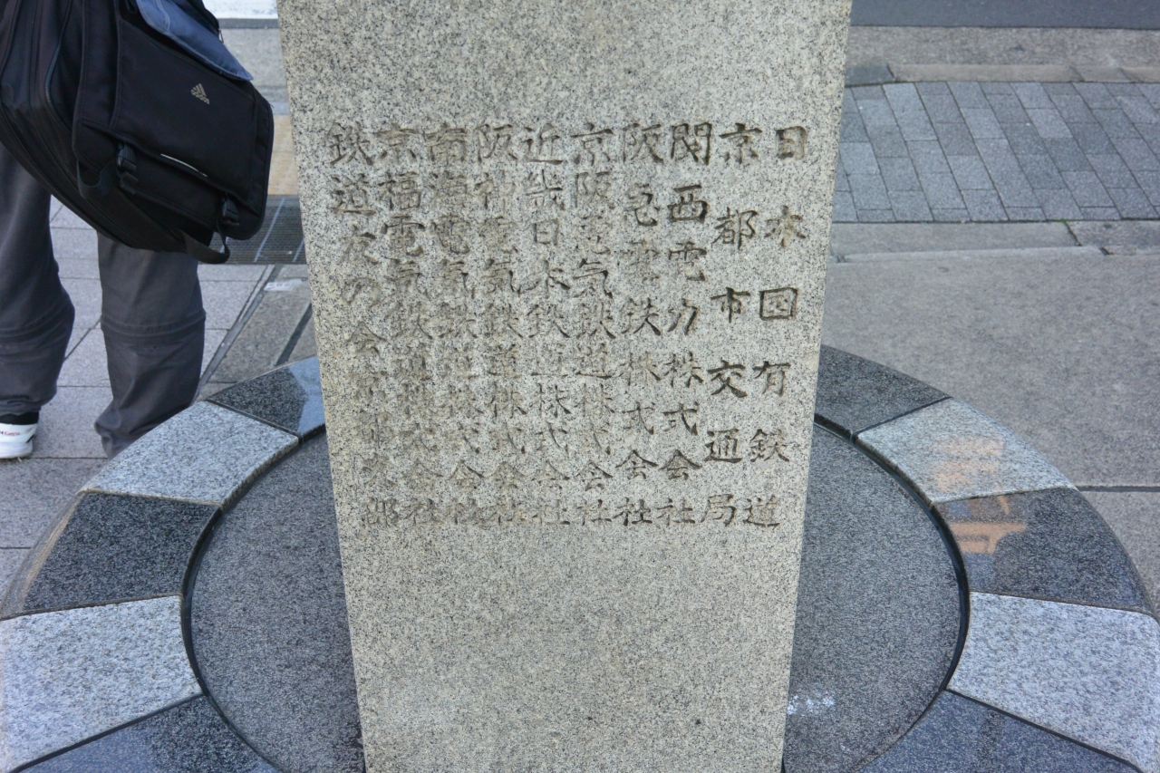 JR京都駅前の広場の北東の角に立っています。ここがひとつの出発点でもうひとつは伏見にあるようです。電気鉄道事業ということで、背面には阪急・阪神・近鉄・南海・京阪・京福電鉄及び、国鉄、京都市交通局、関西電力、そして鉄道友の会の銘が刻んでありました。
