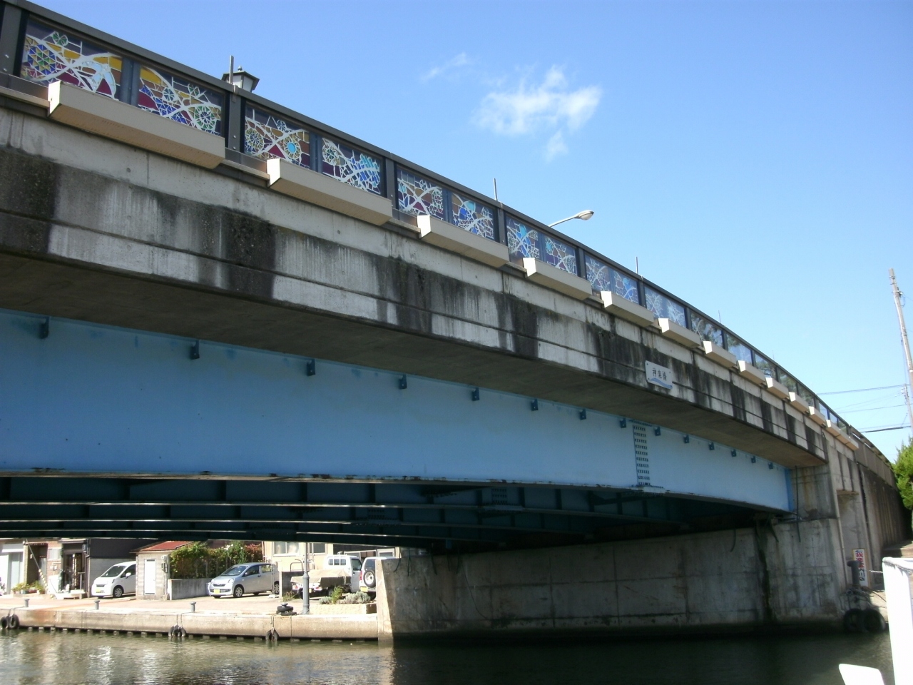 橋の形状そのものは平凡なものですが、欄干には曳山やカモメなどが描かれたステンドグラスがはめ込まれていて見応えがあります。