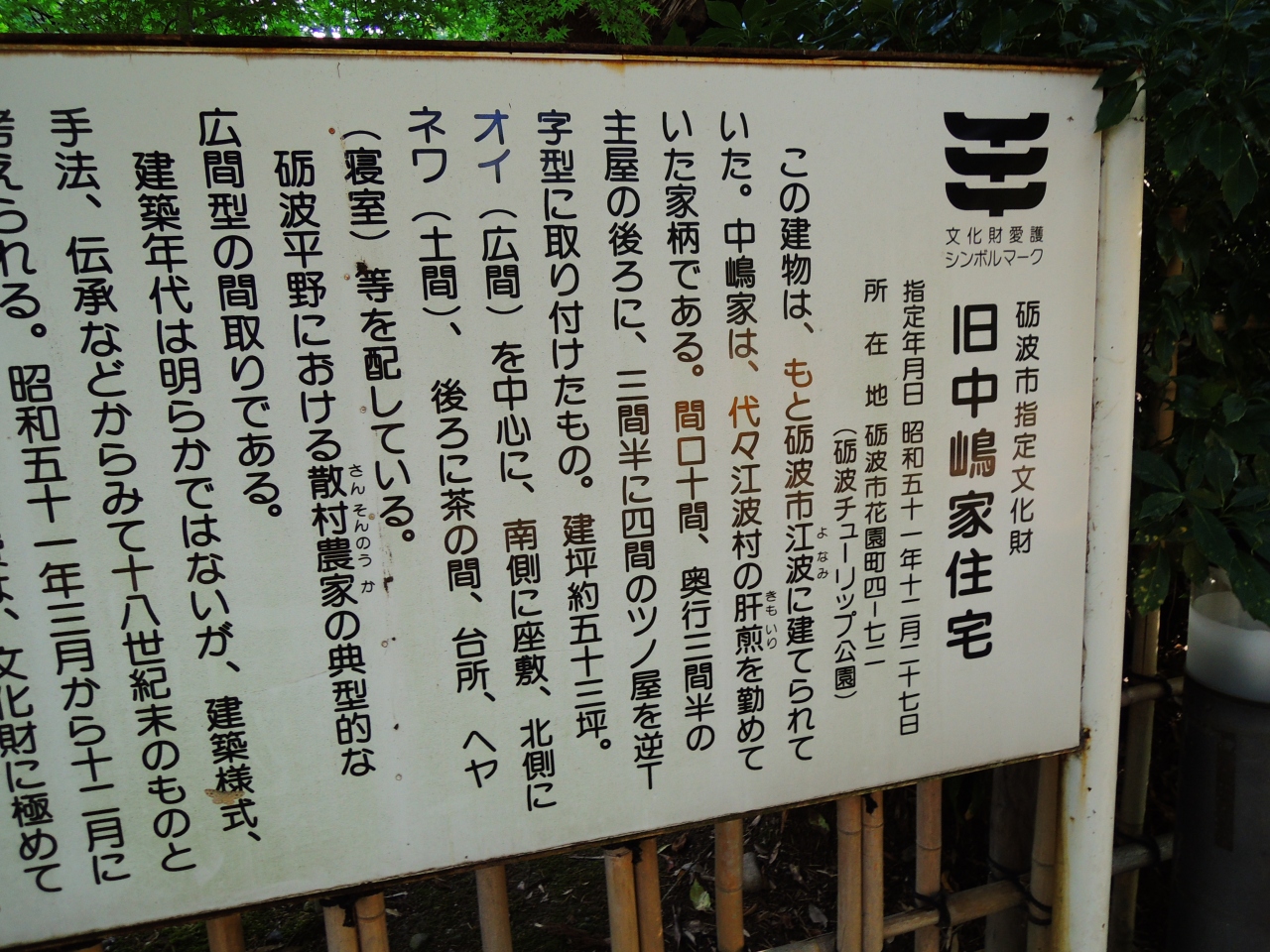 旧中嶋家住宅は砺波チューリップ公園内にある砺波市で最も古い木造建築物で市指定文化財となっています。しかし、チューリップ祭り期間中以外は保護のため通常ははいることができません。