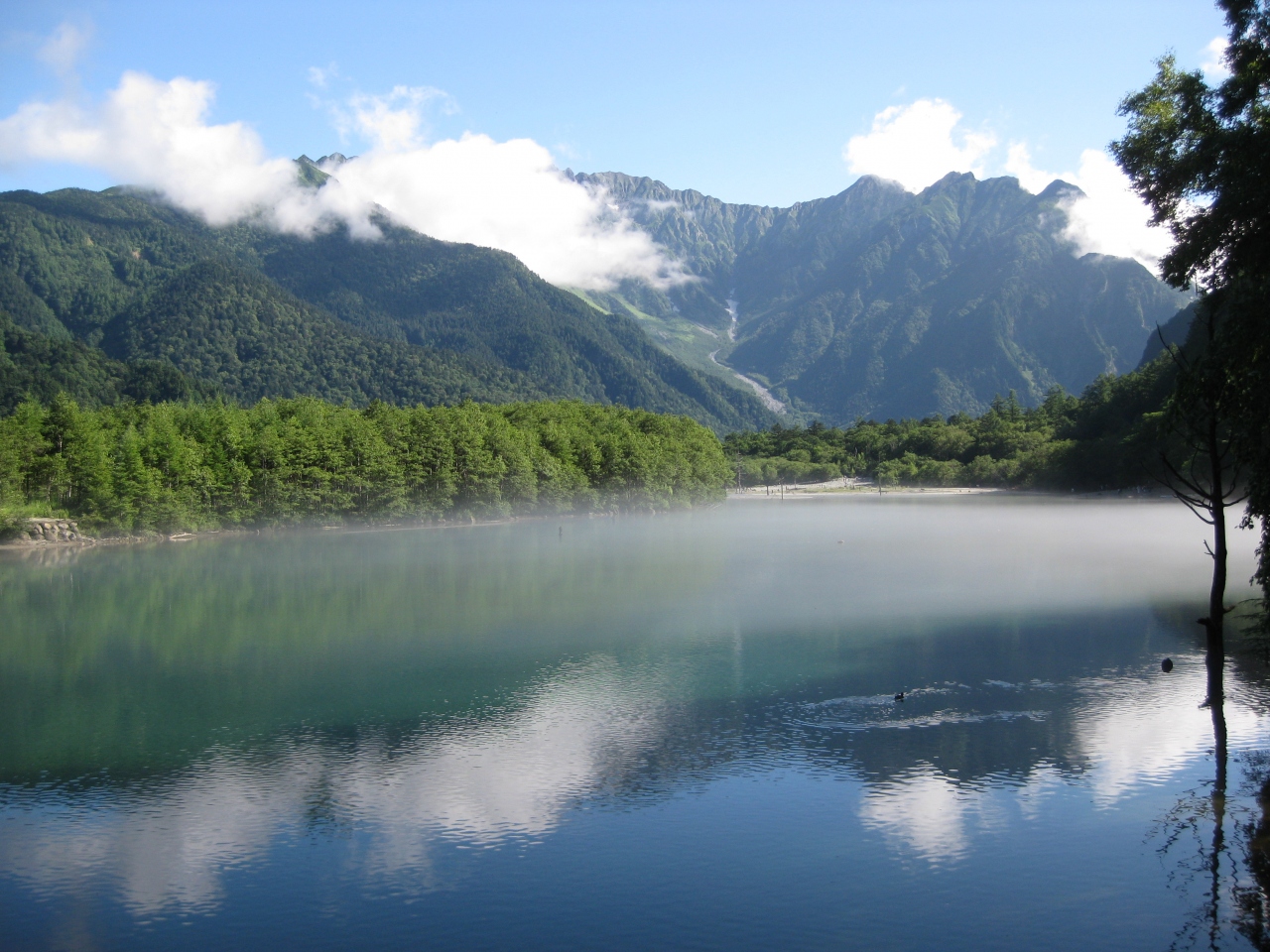 中央自動車道松本ICから車で約1時間の沢渡駐車場で駐車し、シャトルバスかタクシーで上高地へ向かいます。シャトルバスの上高地バスターミナルから徒歩1時間ですが、大正池でタクシーを降りると便利です。朝早めに沢渡駐車場に着きタクシーで上高地バスターミナルへ向かいました。運転手さんが大正池で降りて遊歩道を河童橋まで歩くと神秘的な大正池を見れますよと勧めてくれたので、大正池で降りました。朝もやの大正池を見ることができました。大正池は焼岳の大噴火により梓川が堰き止められて出来た池で水没した林の木々が枯れ木となり池の中に立ってます。