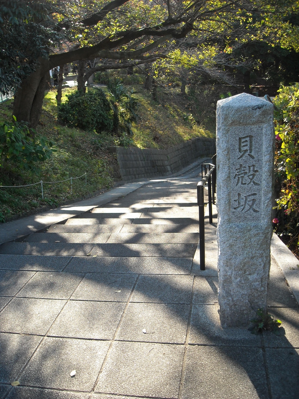 元町公園のプールを右に見ながら登坂してゆくと日本人キリスト信者の墓地を左に見ながらきつくなった坂を左に折れ曲がって我慢すれば山手本通りに到着。貝殻の名の由来は貝塚説と海底隆起説があるそうですが海水と真水の混ざったところは貝の多いところなんです。