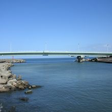 射水市観光協会で頂いた“水辺の回廊&橋マップ”によると、『西漁港と東漁港を結ぶ重要な橋。波や曳山のパネル、本市ゆかりの万葉の歌などが装飾されている。雄大な景観が楽しめる。』と記載されています。