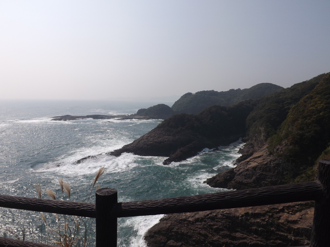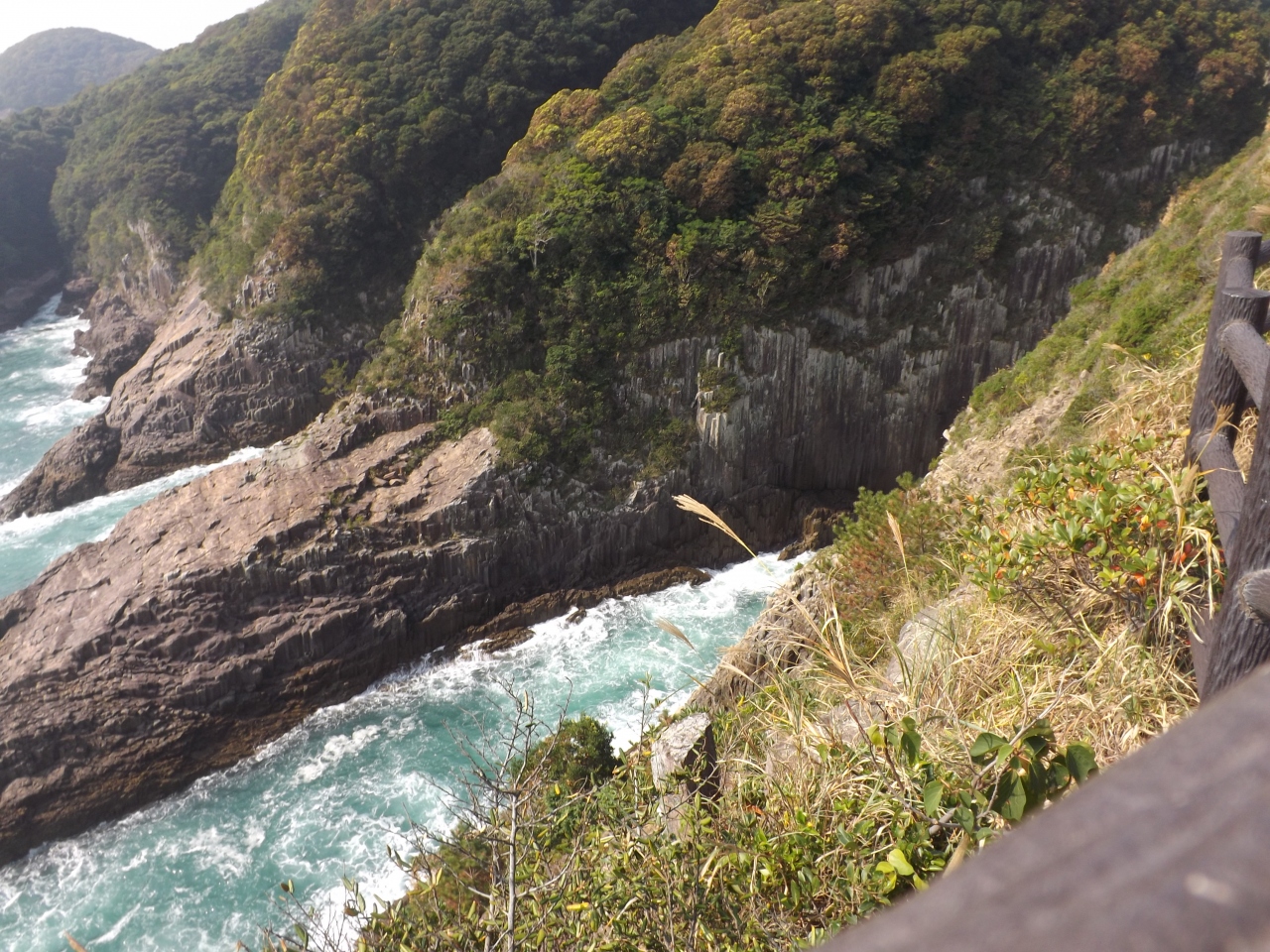 馬ヶ背からほんの少し歩くと日向岬ひゅうがみさき)の断崖絶壁と荒々しい海が見えます。ここも絶景です。西洋人の女性が子供を4人連れて観光に来ていたのですが、かなりお茶目でワンパクな子供達でした。日向岬で、少し頭を乗り出していたので、私の方がヒヤヒヤでした。風景を楽しみながら、同時にワンパクな子供達の安全も気にしながらの見学になりました。観光バスの人達も来ていたので賑やかでした。やはり人気スポットですね。