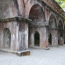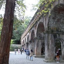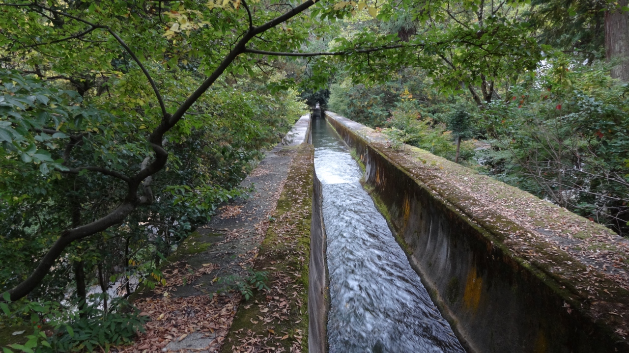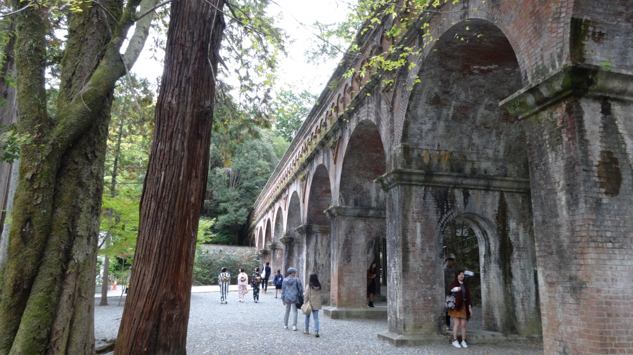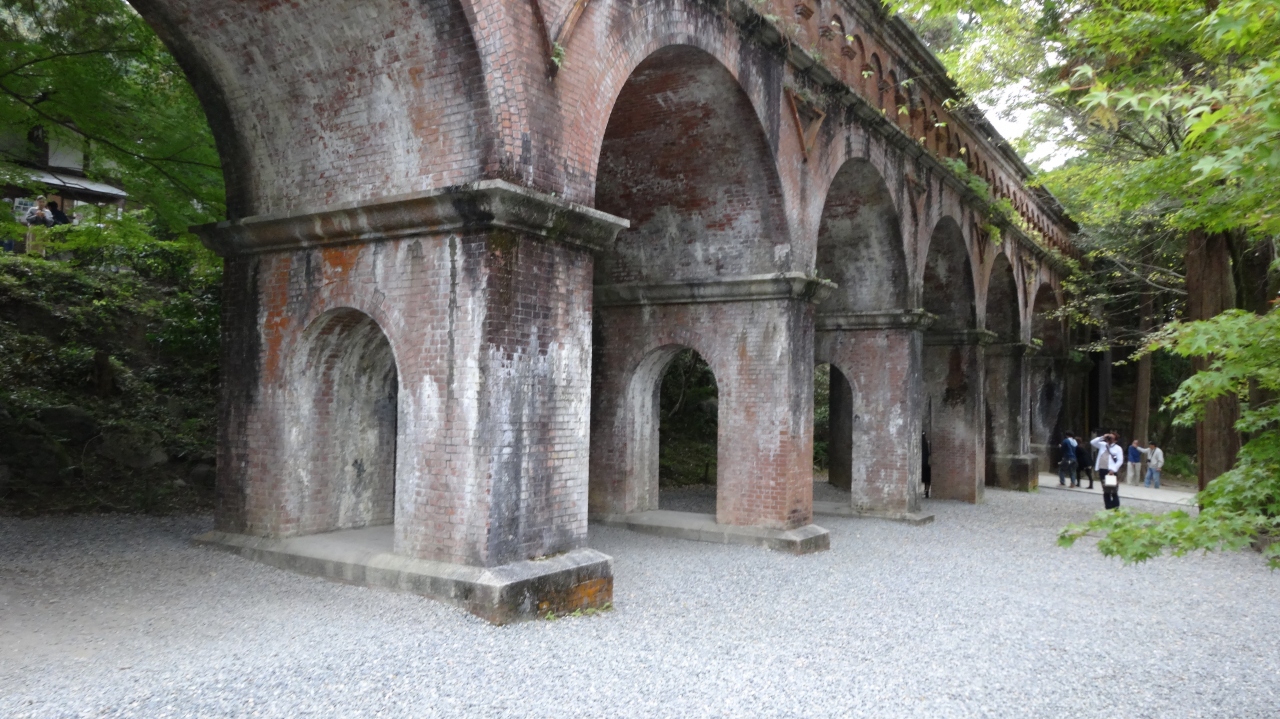 南禅寺の水路閣は、今も現役で琵琶湖疎水の水が勢いよく流れていました。赤レンガの半アーチ型でローマの水道橋と同じです。明治21年に完成したそうです。上に上ることができますが、水の流れは結構速く怖いので、落っこちないよう注意してください。