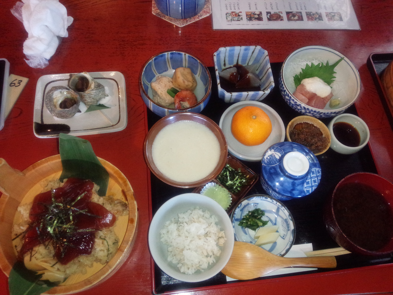 私は手こね寿司の梅(1,190円)にしましたがそれでもお腹一杯になり、他の物を買い食いできないくらいでしたが、伊勢路膳(2,580円)を1つ頼みましたが、凄いボリュームでした。とろろと手こね寿司その他の小鉢、刺身、炊き合わせがありサザエまでついて、他の物が買い食い出来なくなるのが難点です。